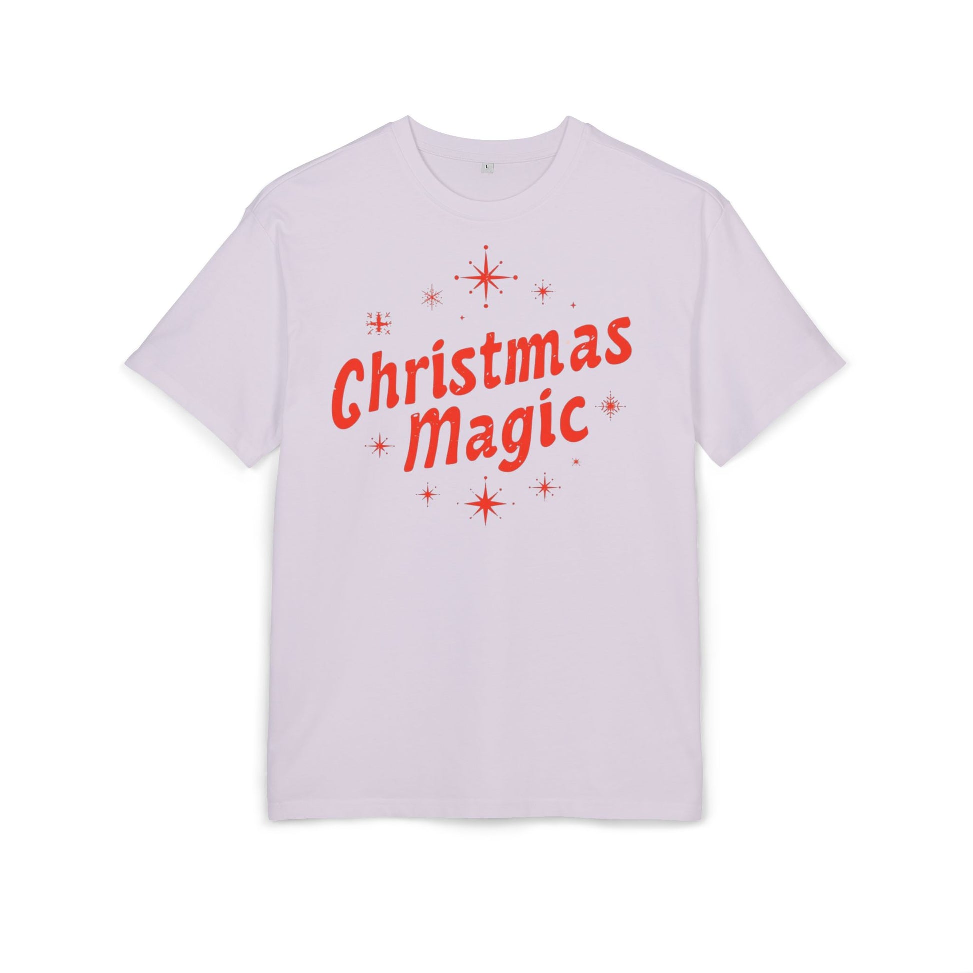 Soft, nostalgic Christmas energy in a relaxed, oversized tee. The heavyweight cotton holds a festive retro graphic—’Christmas magic’ in warm red with starbursts—so the design stays vivid through holiday wear. Throw it on after stringing lights or while sipping cocoa; the wide fit and dropped shoulders create a cozy, laid-back silhouette that layers easily over sweaters or under a favorite coat. It feels lived-in from the first wear and keeps the mood cheerful during carol nights, tree decorating, and slow winter mornings.