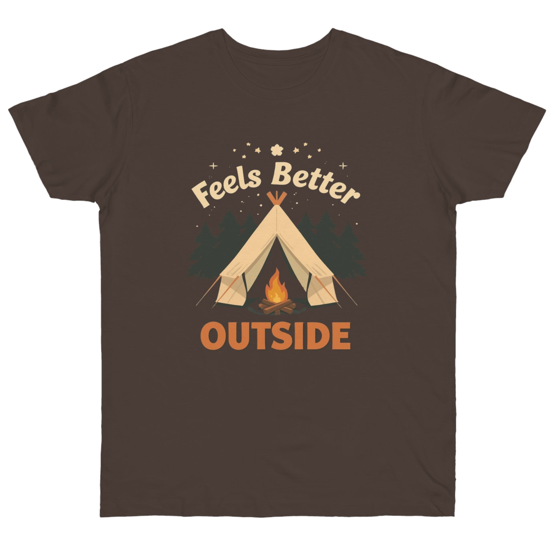 This lightweight tee feels like a quiet evening at the campsite. A warm-to-the-touch palette and simple campsite artwork — tent, crackling fire, and stars — sit centered on a soft brown shirt with the heartfelt line “Feels Better Outside.” It slips on for easy layering on trails or town errands, breathes during long summer hikes, and holds its shape after many washes thanks to reinforced seams.