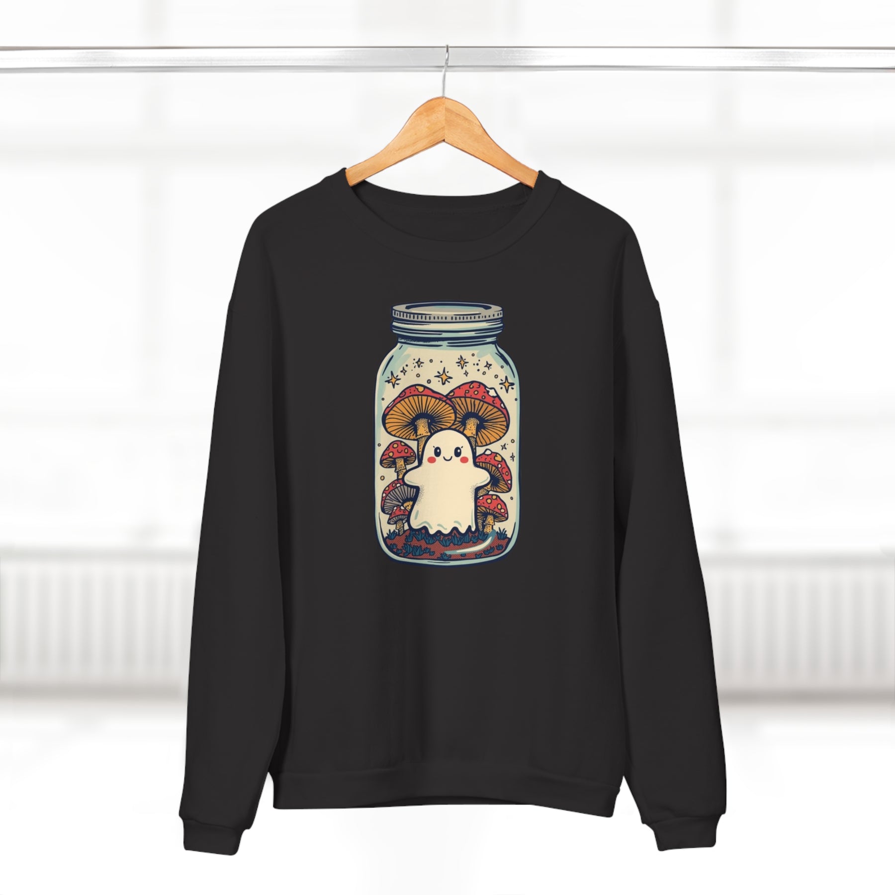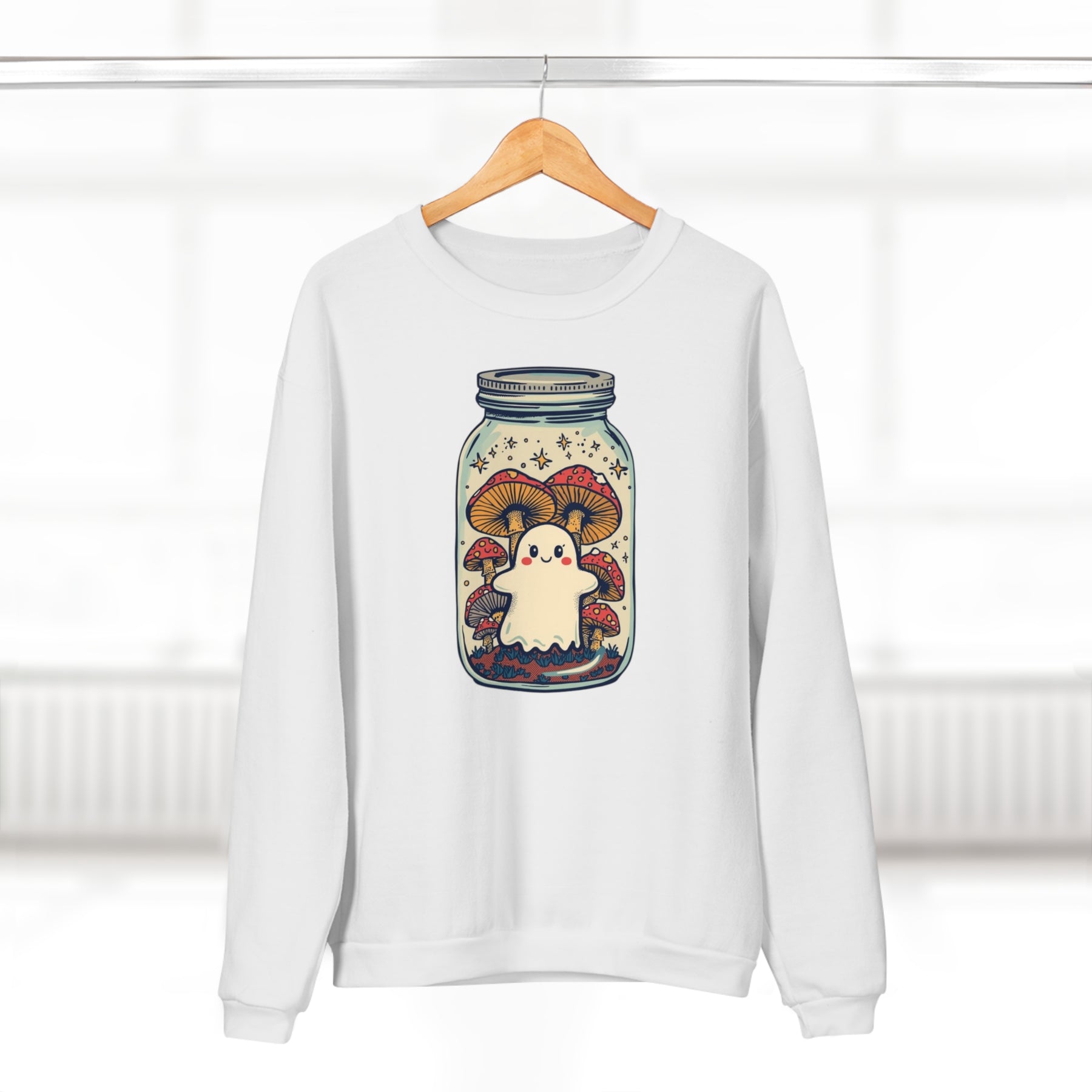 Ein kleiner Geist, eingefangen in einem Glas zwischen Pilzen, Moos und Sternen – verspielt, charmant und voller Halloween-Magie.