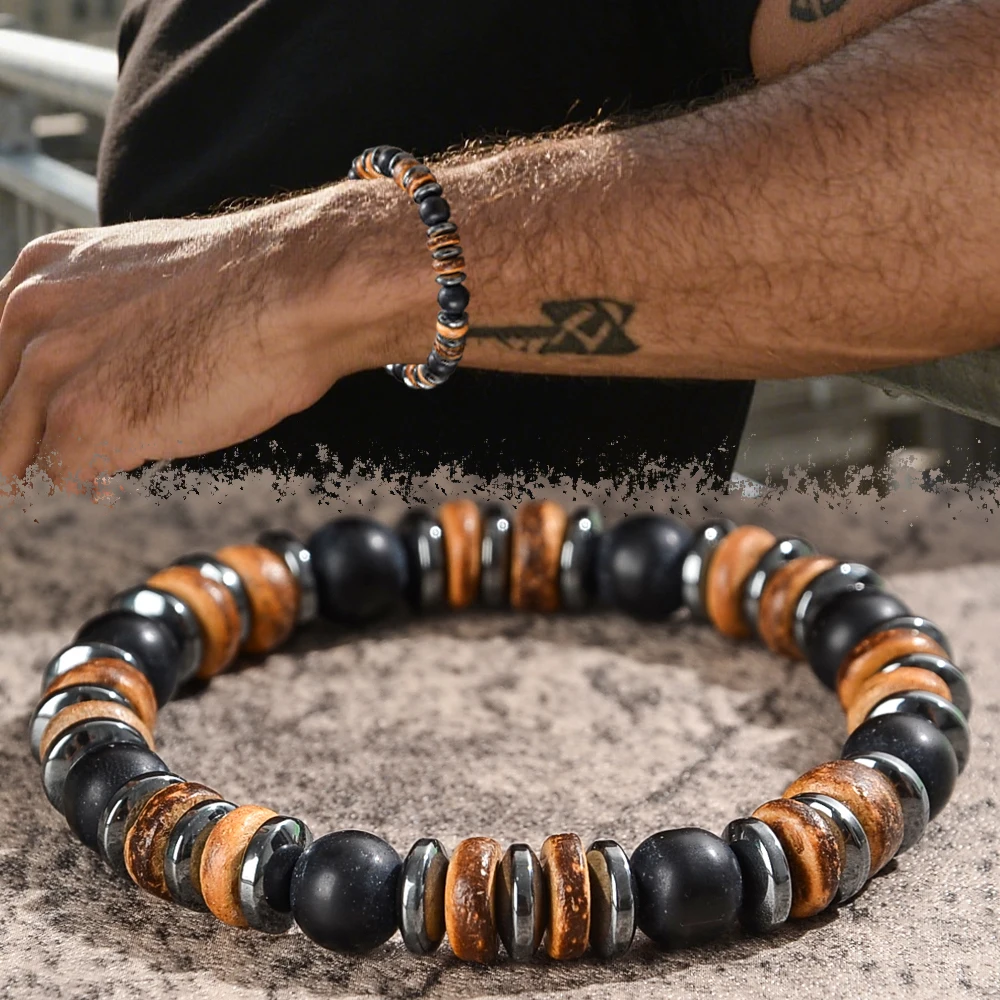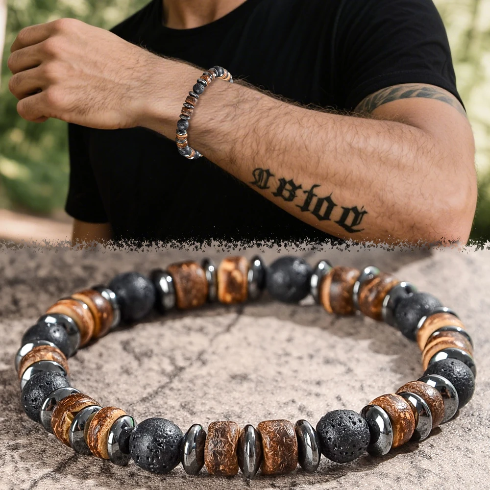 Lava & Holzperlen Armband mit Hämatit – Herren Naturstein