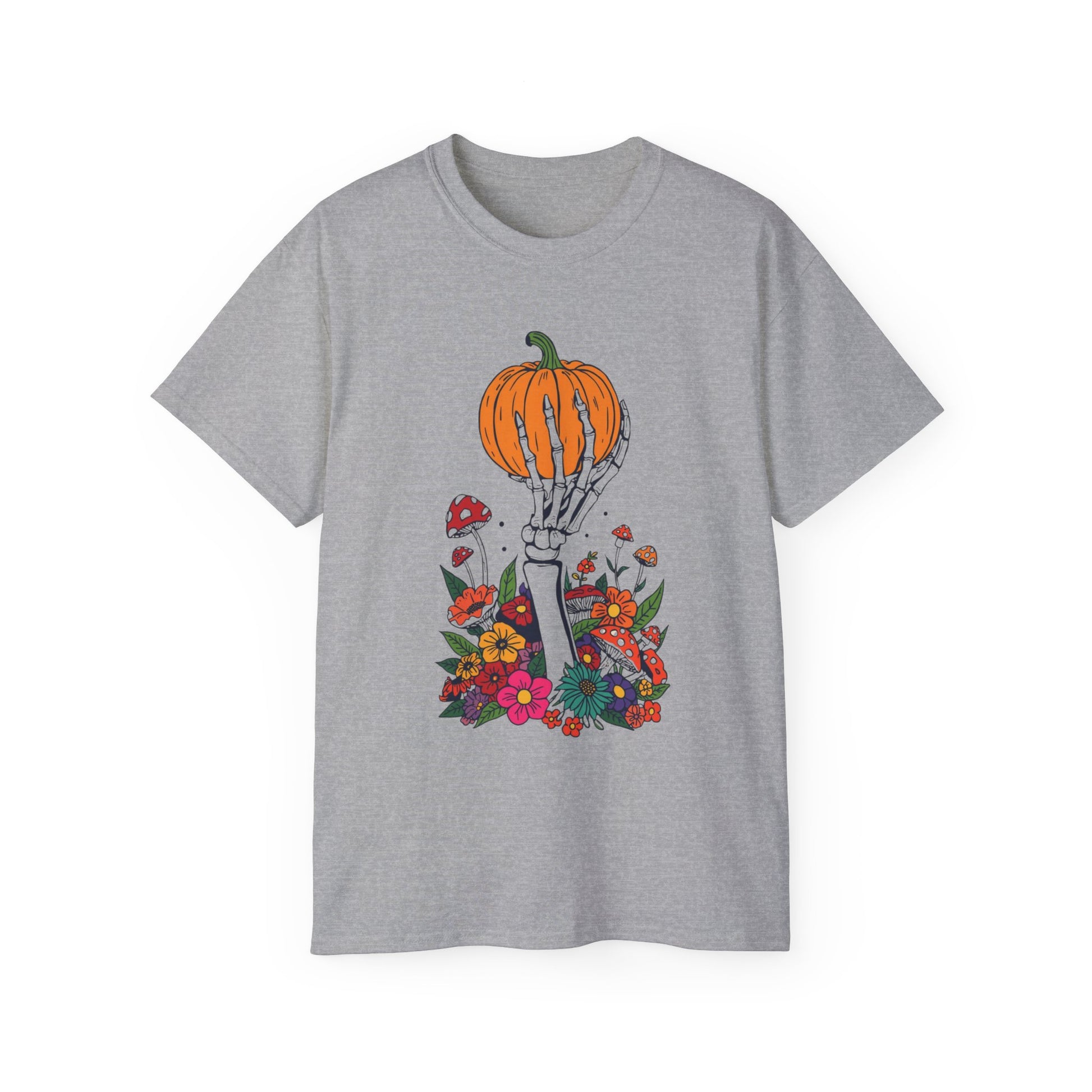Ein Skelettarm hält einen Kürbis, aus dem zarte Blüten und Pilze wachsen – Leben und Vergänglichkeit vereint in einem Design. Dieses Shirt ist ideal für alle, die Halloween mit einem künstlerischen Twist feiern möchten – düster, schön und voller Kontraste. Each movement in this tee feels effortless, as its classic fit and roomy design ensure you stay comfortable all day. Join a community of eco-conscious shoppers, as this tee is made with ethically sourced materials, making you feel good while looking great. Product features - Knitted in one piece for reduced waste and a seamless look - Elastic ribbed collar retains its shape over time - Shoulder tape stabilizes the garment and prevents stretching - Made from environmentally-friendly cotton for a thicker vintage feel - Versatile fit for casual and semi-formal occasions with a classic crew neckline Care instructions - Machine wash: cold (max 30C or 90F) - Non-chlorine: bleach as needed - Do not tumble dry - Do not iron - Do not dryclean