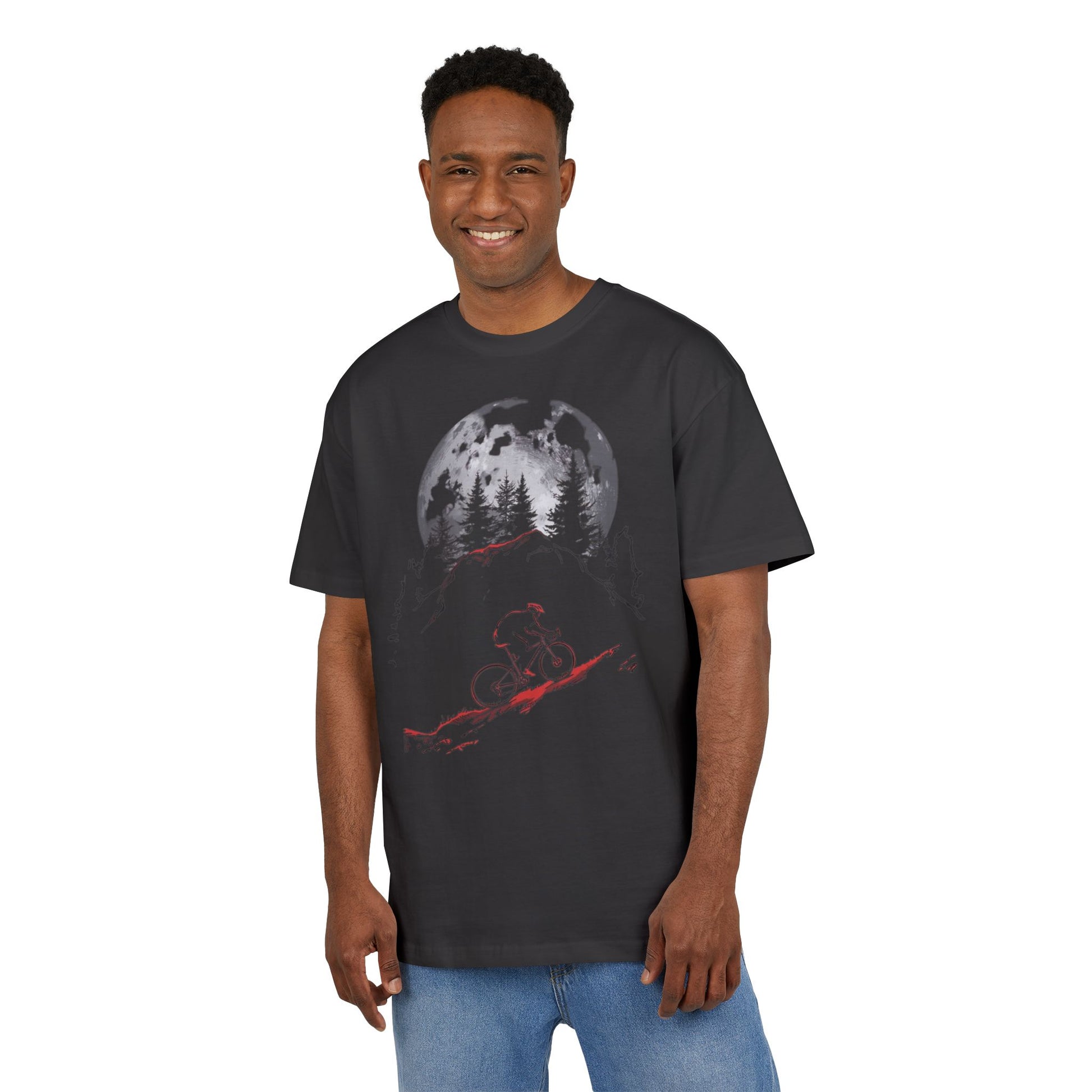 Ein schweres Baumwoll-T-Shirt mit einer ruhigen, schnellen filmischen Ausstrahlung. Das Design zeigt einen leuchtenden Vollmond über einem schattigen Kiefernwald, während eine Gestalt an einem glühenden Lagerfeuer die Szene in glühenden Rottönen abrundet. Der weite Schnitt mit überschnittenen Schultern sorgt für ein lässiges, bequemes Tragegefühl – wie in der Lieblingsjacke geschlüpft auf einer kühlen Nachtwanderung. Tragen Sie es bei Abendspaziergängen, bei Konzerten im Halbdunkel oder wenn Ihr Outfit an Geschichten am Lagerfeuer erinnern soll. Das Shirt fühlt sich hochwertig an, die Druckdetails sind scharf gestochen und es passt perfekt zum entspannten Rhythmus ruhiger Wochenenden und Sternenbeobachtungen.
